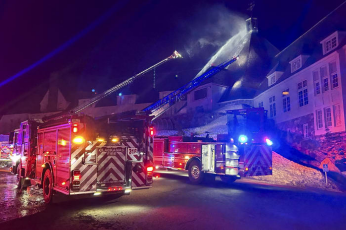 Firefighters extinguish a fire at Oregon’s historic Timberline Lodge, which was featured in Stanley Kubrick’s 1980 film “The Shining,” Thursday evening, April 18, 2024, in Government Camp, Ore. (Clackamas Fire Department via AP)