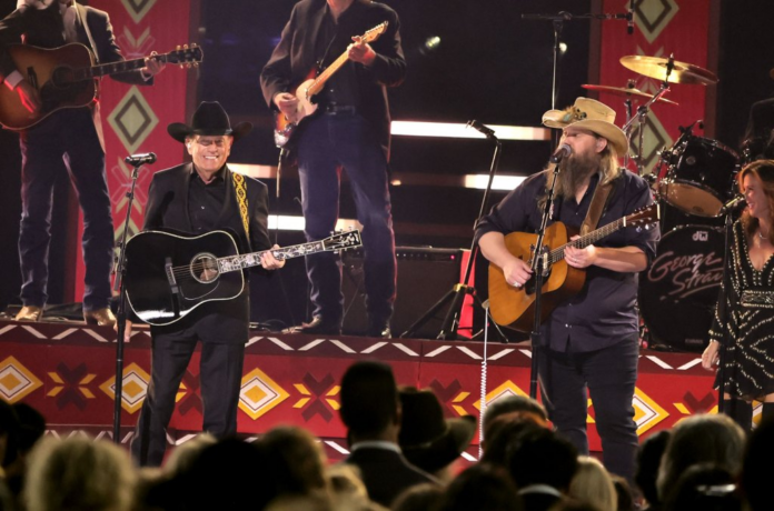 Stapleton also frequented the performance stage multiple times in between winning three awards — more than anyone else this year — opening the show with Post Malone for “California Sober” and duetting Morgane Stapleton on “What Am I Gonna Do?” in addition to joining in on the Strait tribute. The “Psycho” rapper-turned-country star also returned to the stage solo to sing his emotional ballad “Yours,” while Kelsea Ballerini and Noah Kahan teamed up to harmonize on their song “Cowboys Cry Too.”